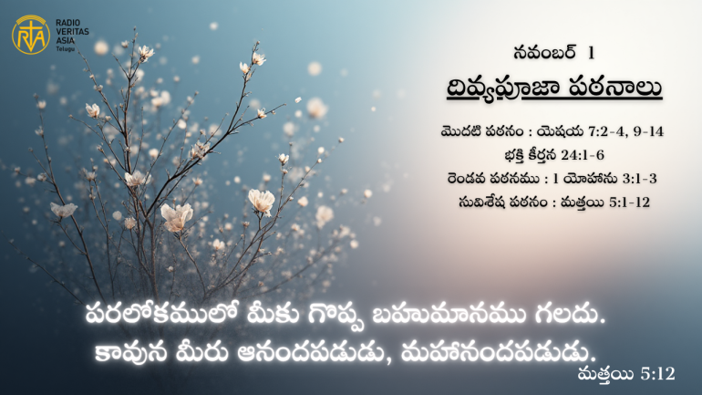 సత్యోపదేశము దివ్యపూజా పఠనాలు |నవంబర్ 1 By Telugu Service, 01 November, 2025 మొదటి పఠనం : యెషయ 7:2-4, 9-14 భక్తి కీర్తన 24:1-6 రెండవ పఠనము : 1 యోహాను 3:1-3 సువిశేష పఠనం : మత్తయి 5:1-12 Tags #catholicchurchnews #catholictelugu #telugucatholic #telugucatholicchurch #radioveritasasia #rvatelugu #PraveenLakkisetti #reflection #advent #christmas #messageof hope #radioveritas #rvatelugu #viral #insta Your name Comment Related వార్తలు మెలిస్సా తుఫాన్ బాధితుల కొరకు ప్రార్థించిన పోప్ లియో. వార్తలు ప్రపంచ విద్యా జూబ్లీని ప్రారంభించిన పోప్ వార్తలు మెక్సికో వరద బాధితుల కొరకు ప్రార్థించిన పోప్ లియో More సత్యోపదేశము సత్యోపదేశము యేసు పవిత్ర హృదయ మహోత్సవము సత్యోపదేశము పవిత్ర గురువారం | Last Supper | సత్యోపదేశము విభూది బుధవారము